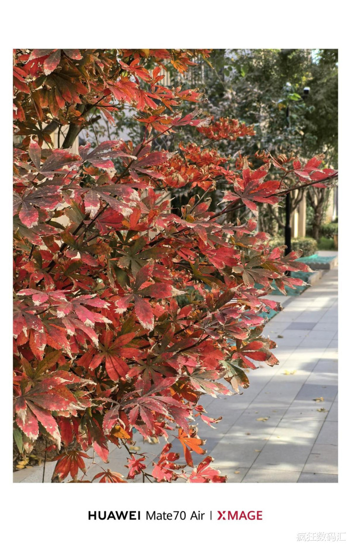 大屏手机在拍照时也具备先天优势:取景框视野更开阔,构图预览更直观。华为Mate 70 Air在此基础上,结合5000万像素旗舰传感器、1/1.3英寸行业同档位领先超感光大底主摄与AI辅助构图功能,让捕捉秋日盛景变得轻而易举。其独有的“红枫原色影像”,能精准驾驭从浓郁秋叶到舞台复杂光线的各种场景,真实还原色彩,杜绝溢出。此外,用户还可通过个性色卡功能,自定义专属影像风格,自由创作并轻松分享。